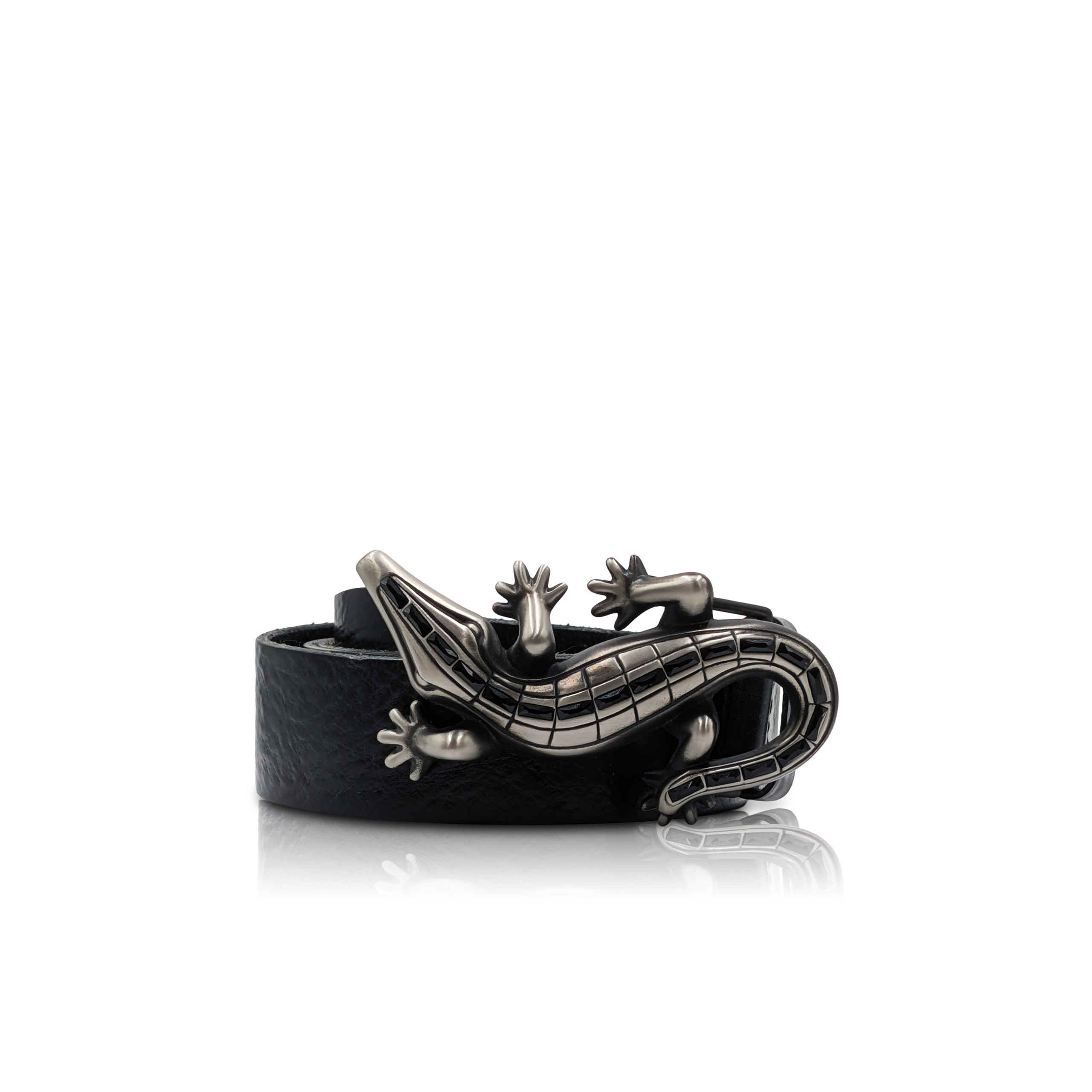Die Onix-Eidechsen-Schnalle ist das zentrale Designelement dieses Gürtels: Sie verleiht ihm eine markante, fast skulpturale Optik und hebt ihn deutlich von schlichten Standardgürteln ab. Das schwarze Leder wirkt edel und lässt sich vielseitig kombinieren – ob zu Jeans, Lederhose, rockigen Outfits oder einem urbanen Casual-Look.